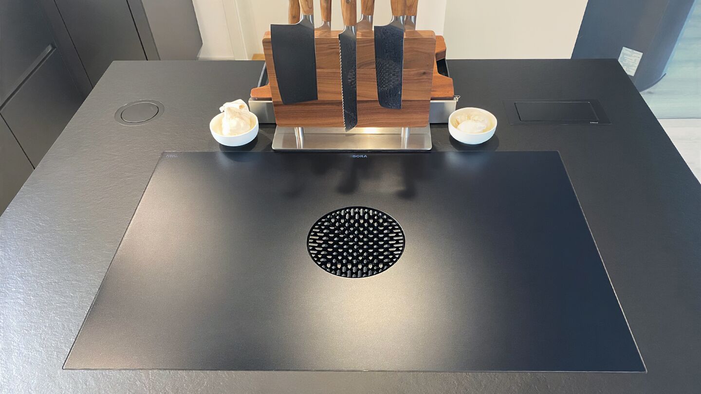 Auch technisch lässt die Küche keine Wünsche offen: Ein BORA Pure mit Aktivkohlefilter, ergänzt um die BORA Grillpfanne, sorgt für moderne Kochtechnik. Hinzu kommen das Vakuumierset All Black, eine versenkbare Evoline® BackFlip USB-Steckdose sowie der hochwertige V-ZUG CombairSteamer.