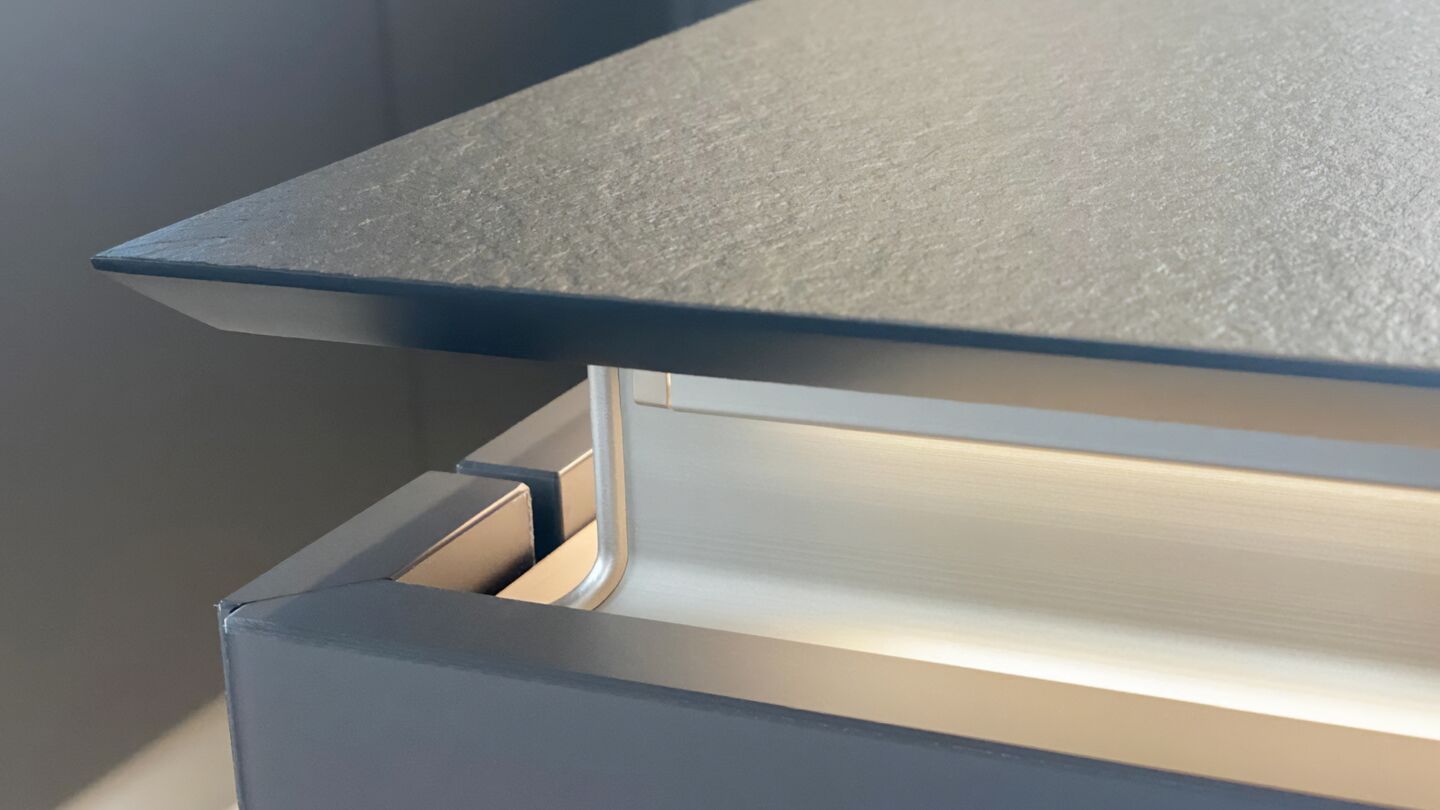Der Korpus in Lavaschwarz (innen und außen, K190) bildet eine kraftvolle Basis, während Griffmulden in Edelstahloptik mit Profil X1/X2/X5 die klare Linienführung unterstreichen. Wangen und Borde in Alteiche Provence Synchronpore setzen einen feinen, natürlichen Akzent, der das dunkle Gesamtbild subtil auflockert.