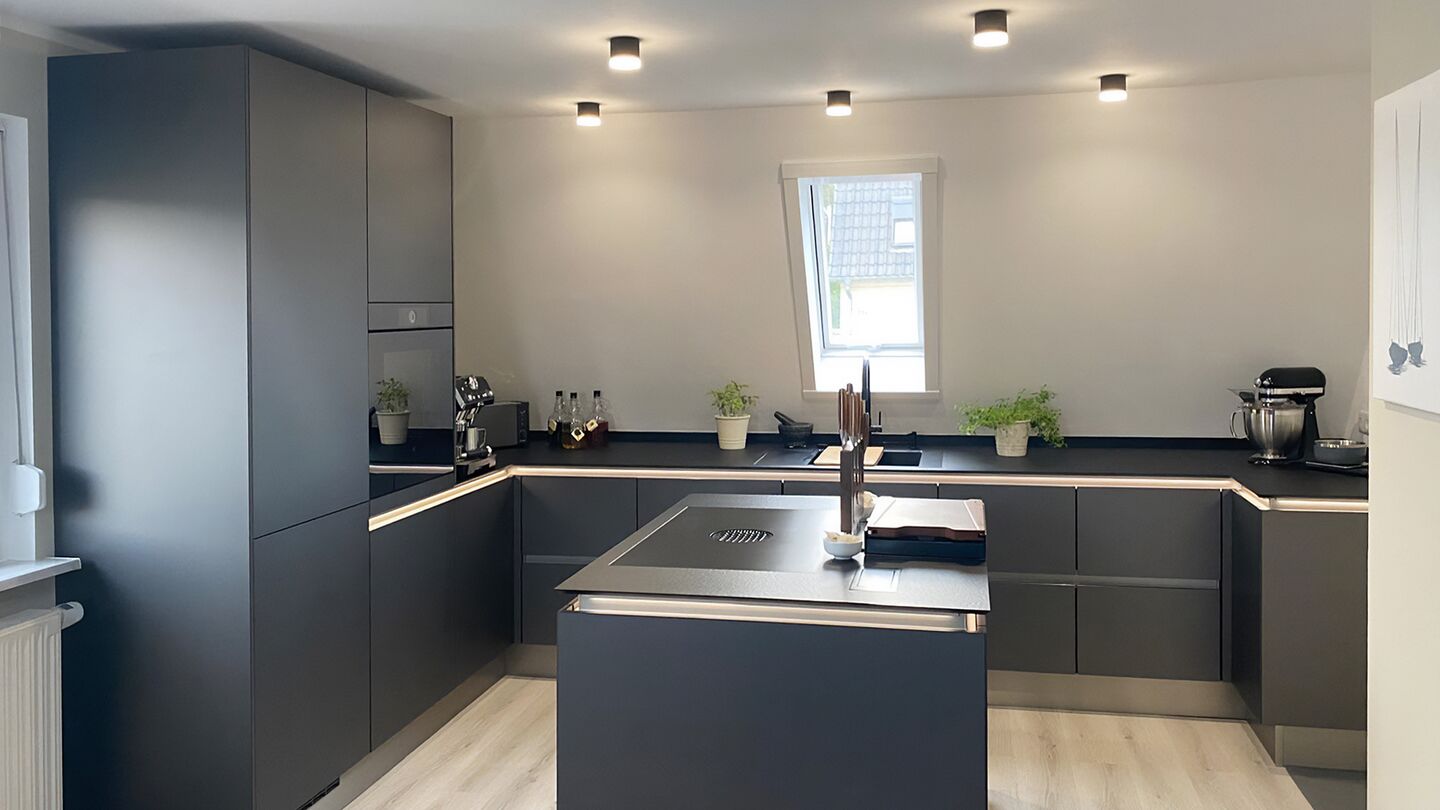 Besondere Raffinesse zeigt sich in den Details: flächenbündig integrierte Geräte, eine großzügige Kochinsel mit ausdrucksstarker schwarzer Arbeitsplatte und stimmungsvolle Lichtführung. So entsteht ein Küchenraum, der Funktionalität und Design auf höchstem Niveau vereint – puristisch, elegant und langlebig.